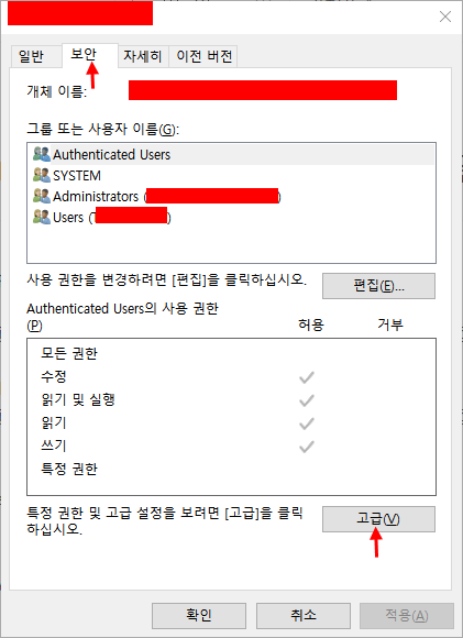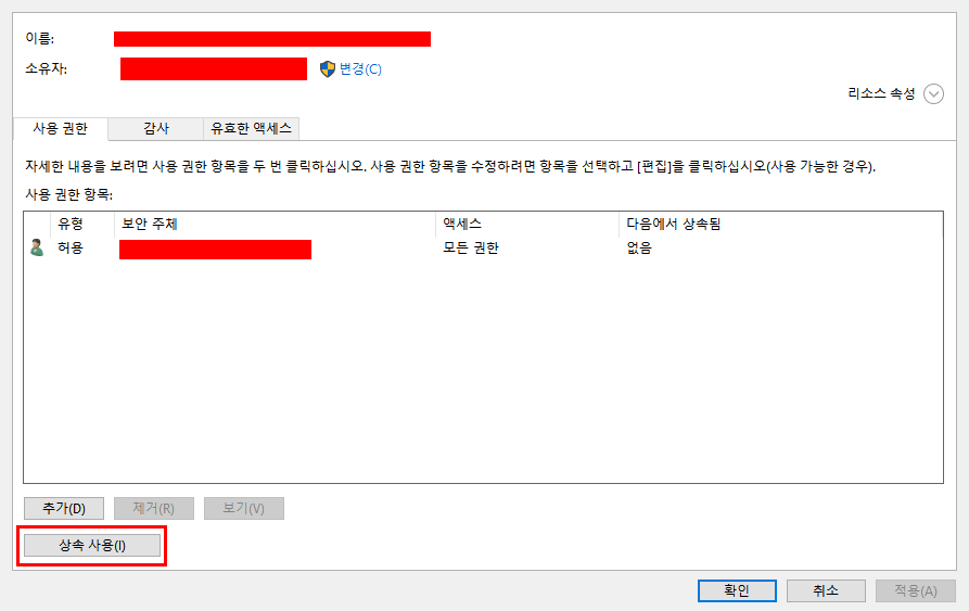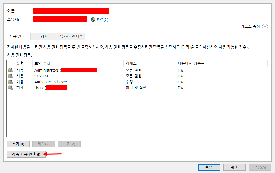 2. '상속사용 안 함'을 클릭해서 사용 권한 항목에 파일의 OWNER만 남긴다.